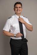 Our Joe pilot shirt is a customer favorite made from a polyester Pima pinpoint fabric blend. This shirt is our most relaxed cut and is fuller with a very slight taper in the body and sleeves. This traditional cut long sleeve looks excellent on its own or paired with our blazer to complete the uniform.